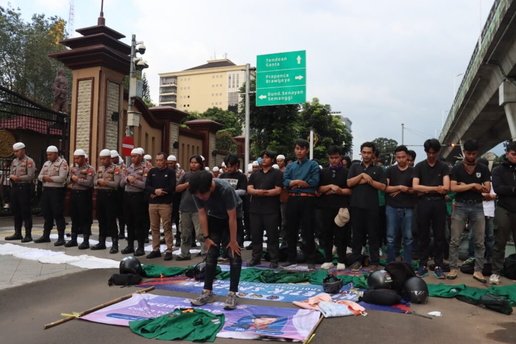 Sejumlah mahasiswa dan anggota kepolisian tampak berdiri dalam satu shaf melaksanakan sholat berjamaah di tepi jalan depan Mabes Polri. Momen tersebut menjadi gambaran suasana yang kondusif di tengah kegiatan penyampaian aspirasi.